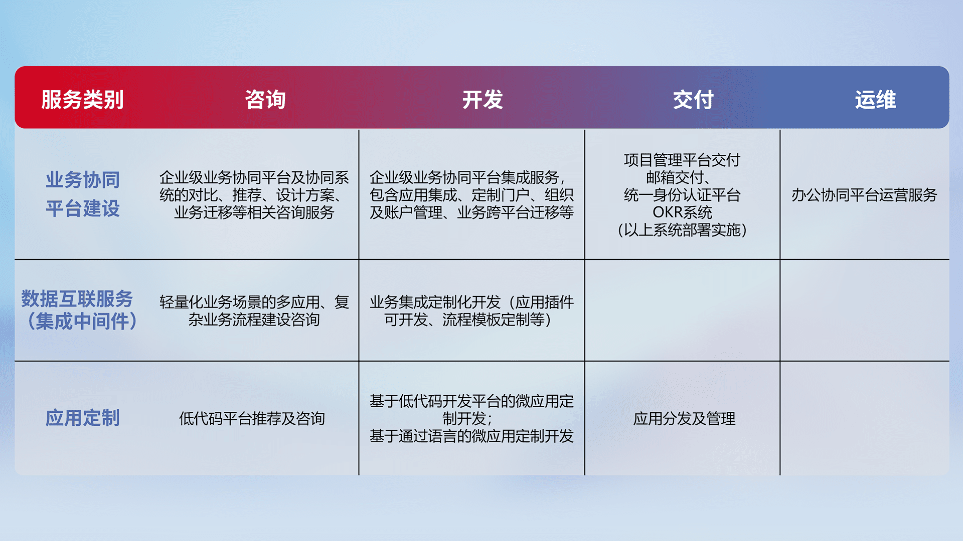 针对钉钉、、、、企微、、、、IDaas等平台级产品提供产品的规划、、、方案、、、交付、、定制化开发等服务,,实现如统一协同办公、、、智能客户服务、、、混合会议管理、、、、智能数据查询、、、、等业务场景,,,实现数字化转型。。。