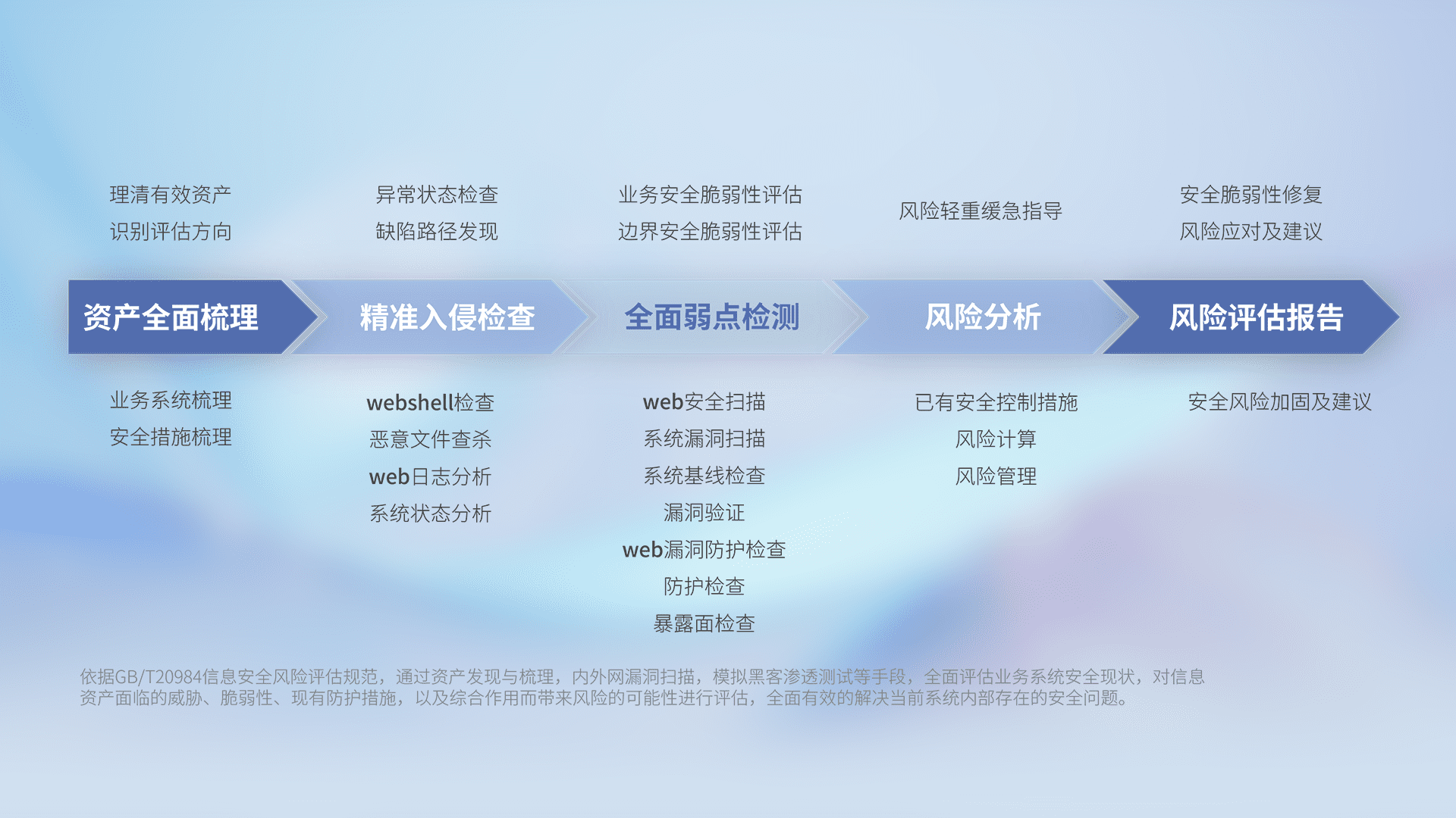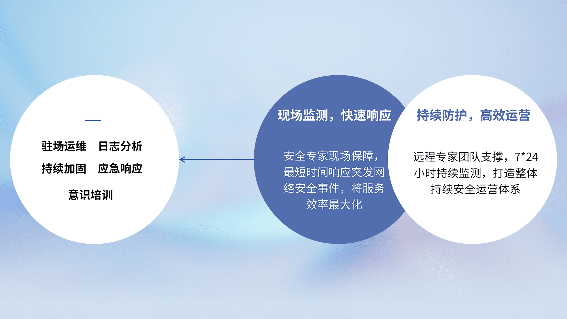 针对客户行业特性,,,,以专业的安全服务+多厂商联合解决方案提供专属的一站式安全管理服务,,,帮助客户全面感知网络空间威胁,,基于识别、、、检测、、分析、、、防护、、监测、、、响应的服务理论模型,,,从方案咨询、、集成交付、、、评估验证、、优化加固、、运维运营,,,致力于为客户提供完整的闭环管理式安全服务。。以实战经验为客户打造高抵御风险的安全体系,,,帮助客户发现威胁、、、对抗威胁、、、、处置威胁,,不断积累安全对抗能力,,,持续保障数字化安全。。